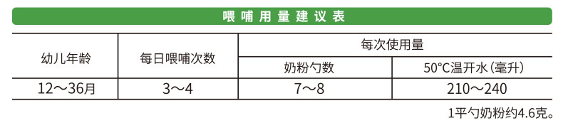 依照喂哺用量建議表,加入正確份量(平勺)的奶粉,請(qǐng)勿刻意壓平量勺。